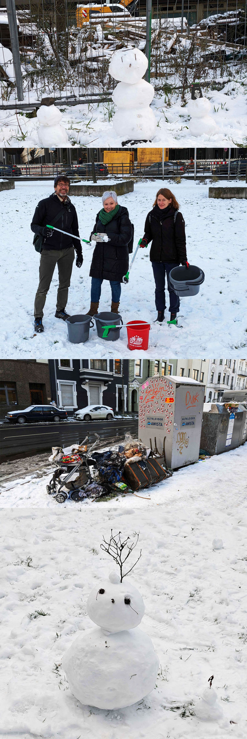 Wer suchet der findet auch im Schnee. Innerhalb von nur zwanzig Minuten trugen die Aktiven die Menge Müll aus dem Kirchplatz-Gebüsch zusammen, was jetzt von der Verwaltung abtransportiert wird. Und auf dem weiteren Weg rund um die Kirche gab es dann noch ein paar vergängliche Kunstwerke zu bewundern, diesmal wohl eher ein Schneemann.