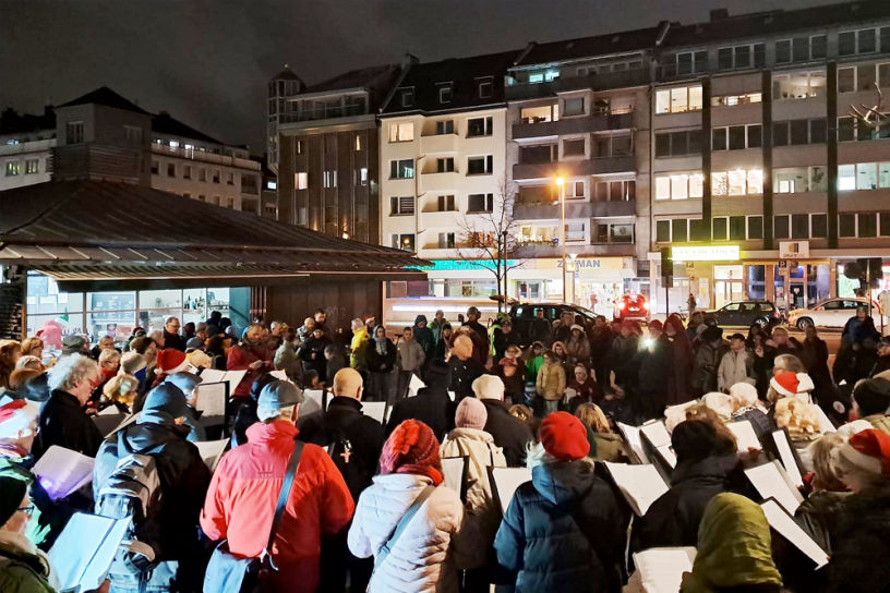 Die sich im Wind duckenden Menschen stoppten auf dem Fürstenwall als sie den Chor des Bürgerhaus Bilk vernahmen. Da wechselte man doch flott die Straßenseite und begrüßte den Glühweinausschank. Die etwas über vierzigstimmige Chor brachte sechs adventliche und nicht adventliche Lieder, zum Schluss entsprach man dem Wunsch aus dem Publikum und brachte "Oh du Fröhliche..." zum Mitsingen.