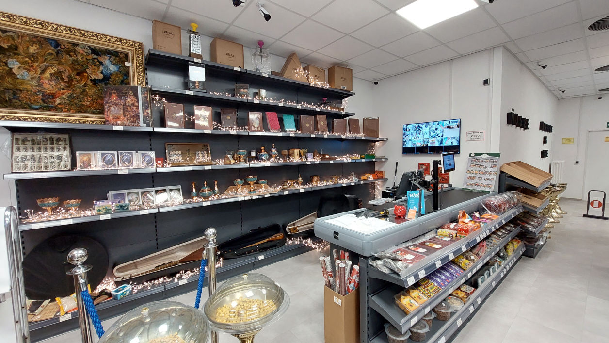 Links hinter der Theke warten traditionelle Instrumente wie eine Oud auf versierte Musikanten, die sie zu spielen wissen. Auf einem Bildschirm ist zu sehen, wie einige der Geschenkartikel im Sortiment aufwendig von Hand hergestellt werden. Edle Gefäße für Süßigkeiten oder Räucherwerk, kleine Teekannen und fein geschliffene Teegläser sind weitere Hingucker.